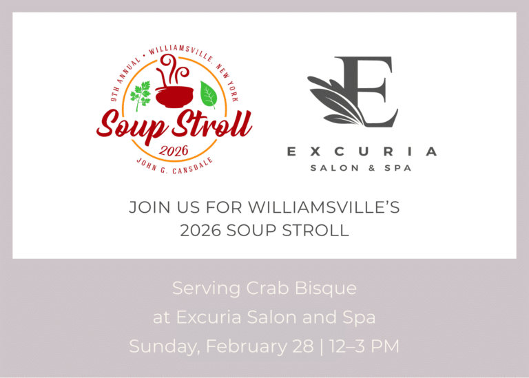 We are excited to be Stop #2 on the 9th Annual John G. Cansdale Williamsville Soup Stroll. Join us on Saturday, February 28 from 12–3 PM at Excuria Salon & Spa as we take part in one of Williamsville’s most beloved winter traditions. What