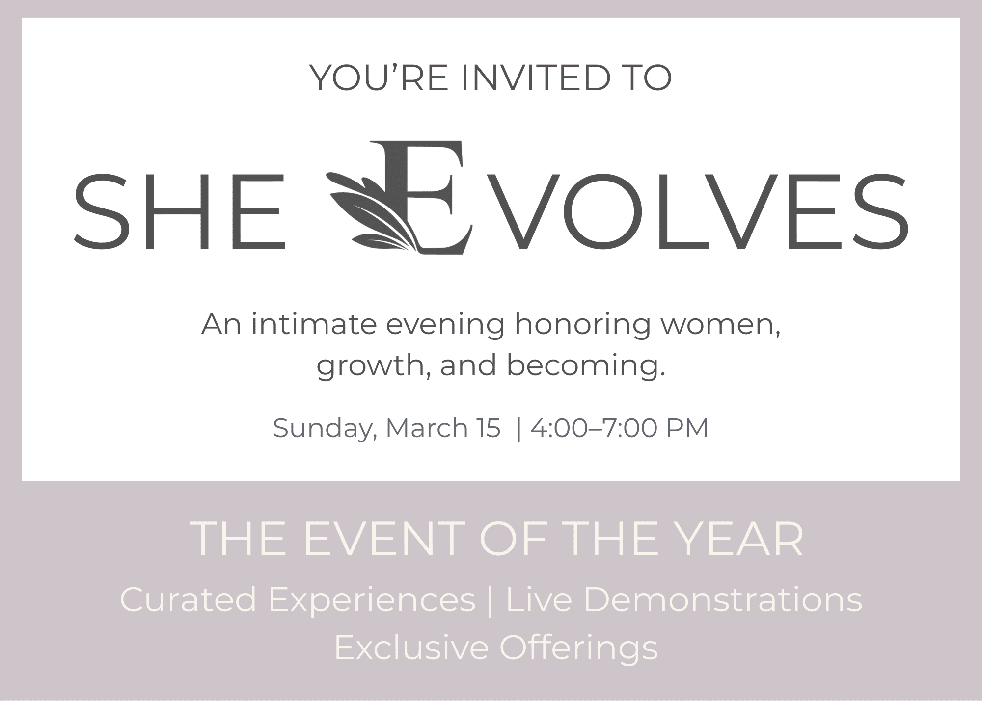 She Evolves marks one year in our Williams Place home. Over the past year, this space has grown into more than a salon and spa. It has become a place of connection, care, and elevated wellness. This evening is a reflection of that journey and an opportunity to gather, explore, and celebrate together.